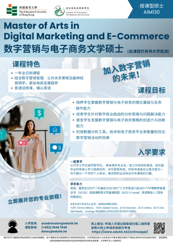 香港教育大学将于2025年10月22日16:30-17:30在管理学院学术报告厅(a南406)举行该校“电子竞技运动管理硕士”、“数字营销与电子商务硕士”项目的介绍与交流。此次活动主要面向高年级本科生和在读研究生,欢迎各位有兴趣的同学参加交流。