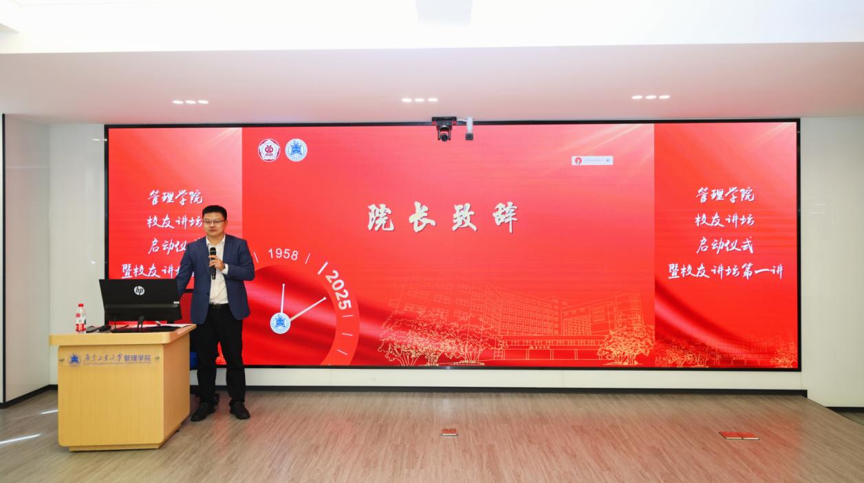 在启动仪式上,吴小节代表学院对校友一直以来对母校和学院的关心支持表示感谢,并介绍了学院近年来发展情况。他指出,校友是学院最宝贵的财富,是学院发展的重要支撑。校友讲坛聚焦搭建“实务课堂”、激活“创新引擎”和凝聚“管院力量”三大核心目标,是学院推动“校友反哺、师生共学、产研融合”的重要举措。他希望校友论坛成为思想碰撞的高地、情感链接的纽带和社会服务的窗口,希望校友们常回家看看,将讲坛作为分享智慧、启迪后学的新起点,助力学院培养更多“懂管理、通产业、敢创新”的复合型人才。