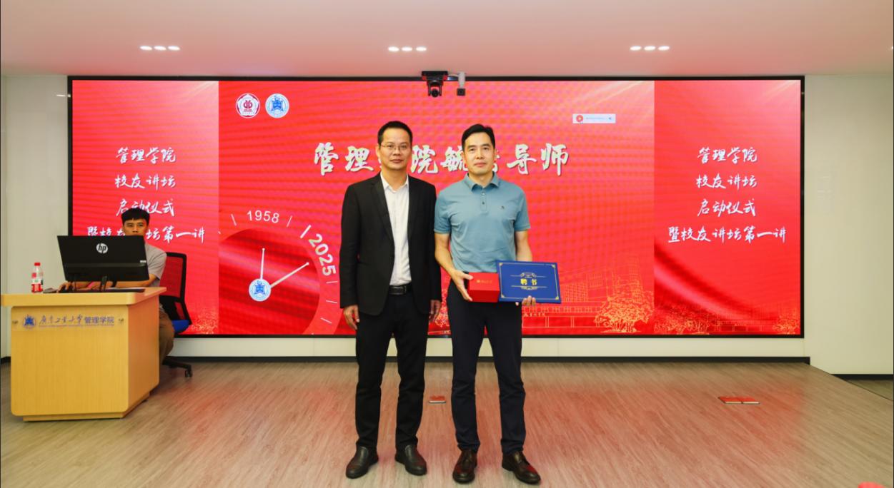 学院党委书记黄培清为2003届校友、华为技术有限公司车bu营销服coo蓝恩来先生颁发“毓秀导师”聘书。蓝恩来校友在it行业深耕20余年,拥有丰富的研发、销售与管理经验,他加入导师队伍将为在校生带来宝贵的职场智慧与人生启迪。