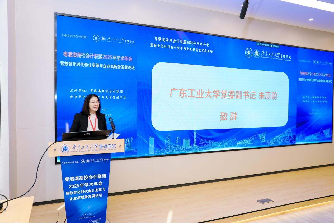 上午8:45,年会开幕式在广东工业大学管理学院隆重举行,由管理学院院长吴小节教授主持。广东工业大学党委副书记朱蔚蔚出席并致辞。她指出,粤港澳高校会计联盟学术年会作为凝聚学术智慧、碰撞思想火花的重要平台,紧扣“数智化时代会计变革与企业高质量发展”主题,有望催生一批兼具理论深度与实践价值的新思想、新成果,为会计学科创新发展提供有力支撑,进而为粤港澳大湾区乃至全国的会计行业升级、企业转型发展与经济高质量增长贡献学术力量。