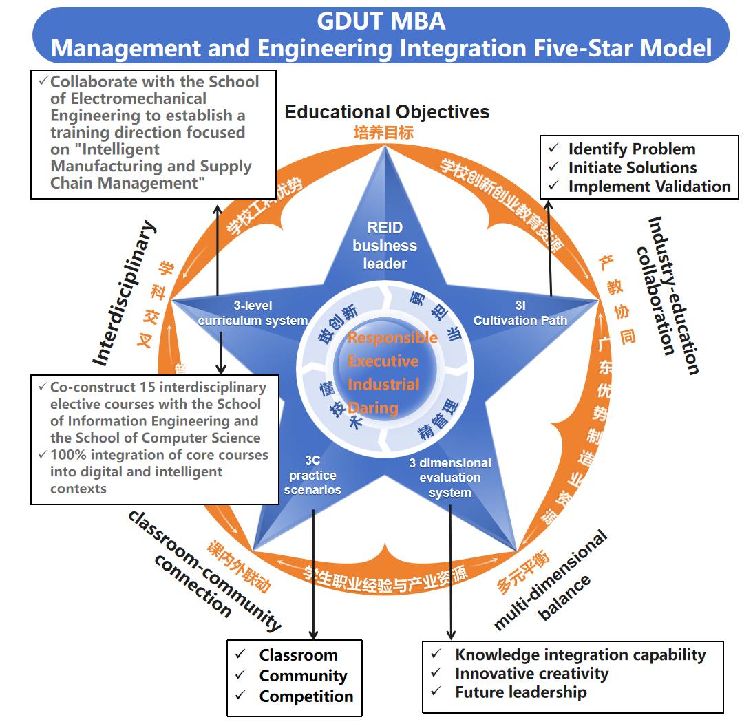 管工融合五星包括,第一星,“勇担当(responsible)、精管理(executive)、懂技术(industrial)、敢创新(daring)”的睿德(reid)型商界领袖育人目标;第二星,以管工融合“3层次课程体系”夯实学科交叉基础;第三星,以“3i培养路径”贯通产教协同机制;第四星,以“3c实践场景”促进学习的课内课外联动,形成了融合创新的教学体系;第五星,围绕“睿德三力”构建多元平衡的评价体系,以保障育人质量的持续改进,为学生的持续成长引领方向。