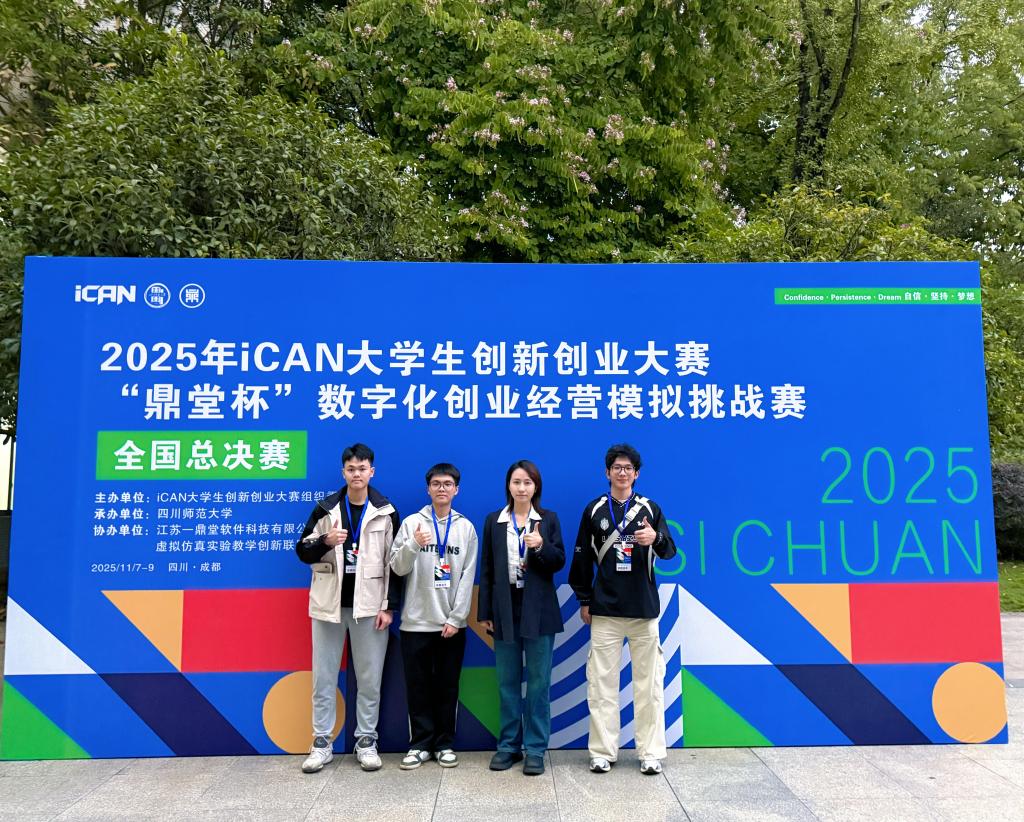 11月8日,2025年ican大学生创新创业大赛“鼎堂杯”数字化创业经营模拟挑战赛全国总决赛在四川师范大学举行。管理学院参赛团队凭借现场出色的发挥,从150支进入总决赛的队伍(其中本科组132支,高职组18支)中脱颖而出,斩获一等奖!