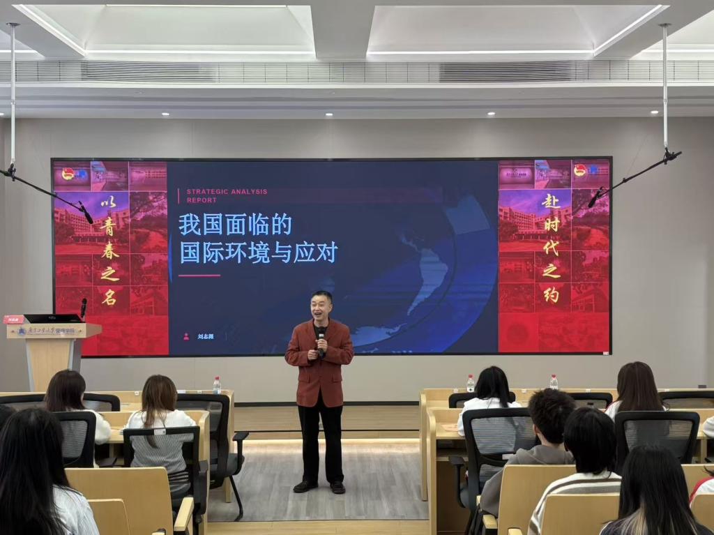 导师传真知,赋能助成长。短暂休息后,毓秀讲堂第108讲暨关工委专题讲座正式开启。本次讲座特邀学院原工会主席、硕士研究生导师刘志渊副教授担任主讲人。刘志渊副教授以《我国面临的国际环境与应对》为主题,结合自身丰富的教学、科研与实践经验,用详实的案例、清晰的逻辑,从国际环境的现状分析、核心挑战、应对策略三个层面展开深入解读,既有理论高度,又有实践指导,为与会师生打开了国际视野,带来了深刻的思想启发。