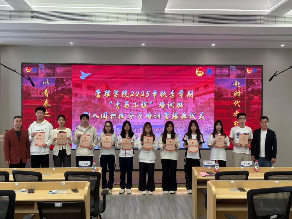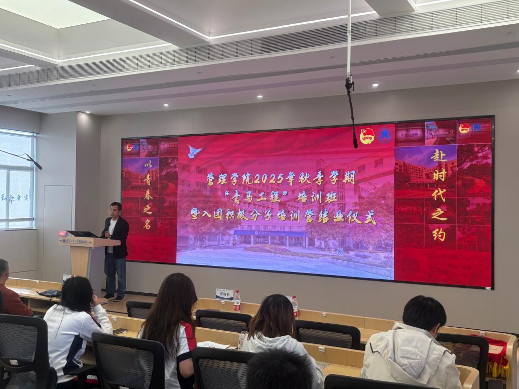 12月30日下午,管理学院在a南607举办毓秀讲堂第108讲暨关工委专题讲座。讲座开始前,学院进行了2025年秋季学期“青马工程”培训班暨入团积极分子培训营结业仪式。学院党委副书记何绍彬、学院原工会主席刘志渊副教授出席活动,全体青马学员、入团积极分子及部分师生代表共同参与,活动由学院团委书记吴燕鹏主持。